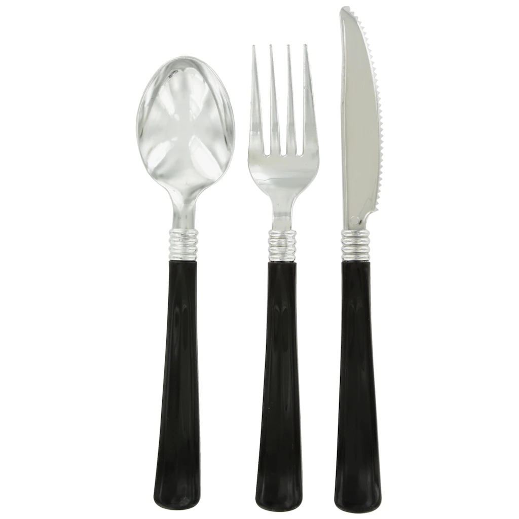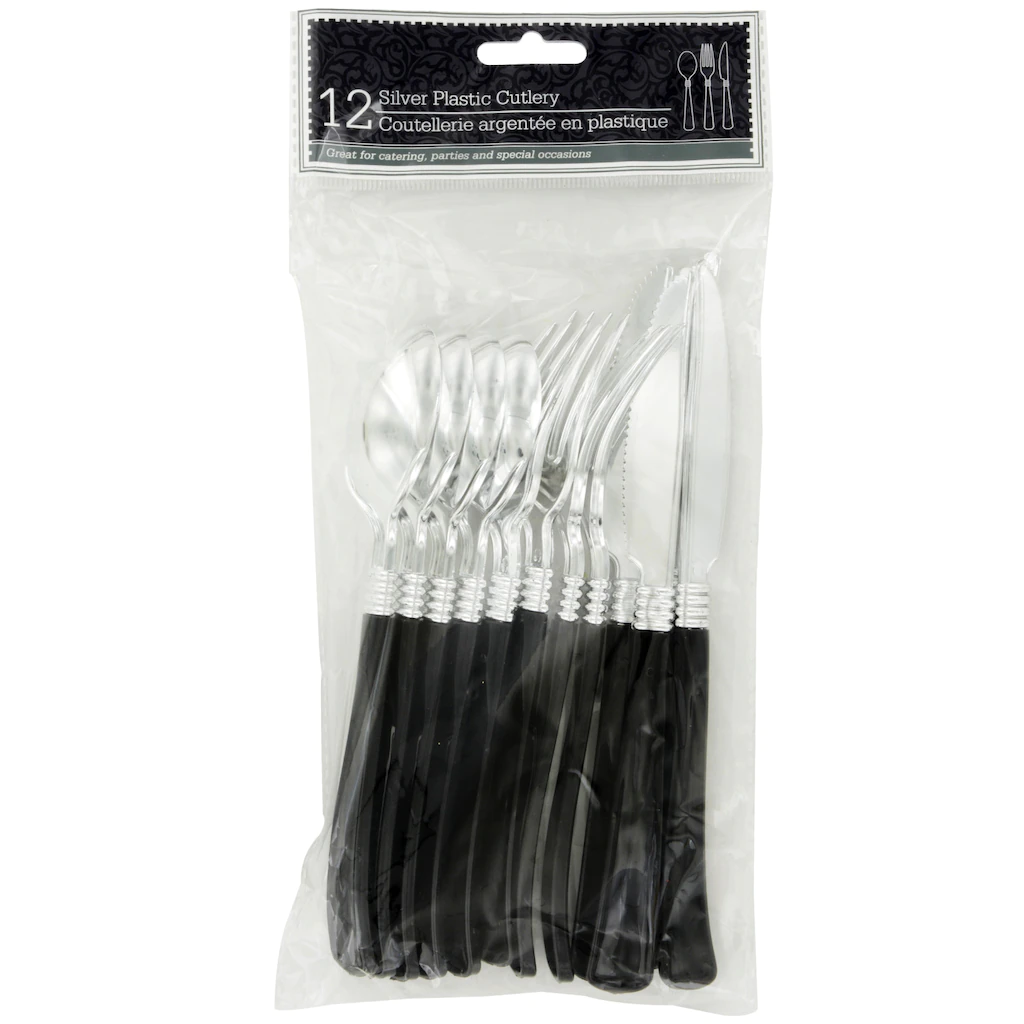 Assortment Details: 12-ct. Packs of Silver Plastic Utensils with Black Handles
