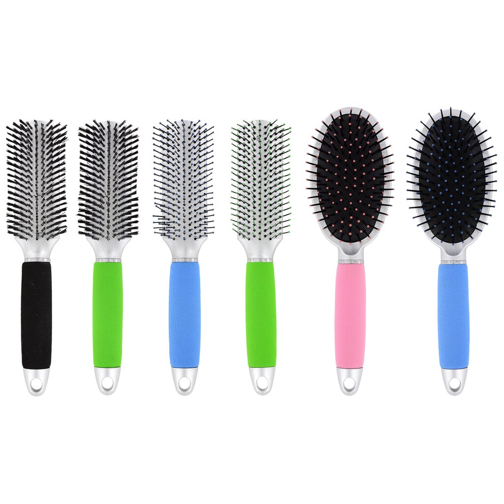 Plastic styling brushes are ideal for protecting hair and scalp while brushing and styling. Plus, soft contoured handles let you keep a firm grip! Assorted among cushion brushes, styling brushes with rubber tipped bristles, and styling brushes with bunched bristles and among black, green, blue, and pink soft grip handles.