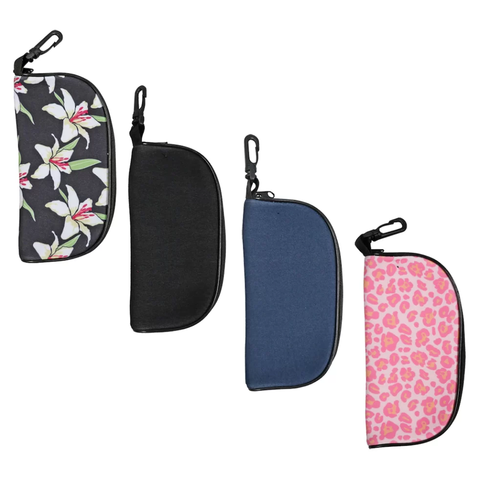 Assortment Details: Soft Polyester Sunglass Cases assorted among floral, black, blue, and pink animal print