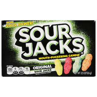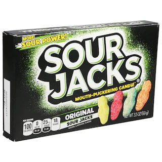 There is more sour power in every box of these Sour Jacks mouth puckering candy made with natural and artificial flavoring. These theater boxes are ideal for having in purses, backpacks, taking on car trips, having on movie nights, and so easy to share.