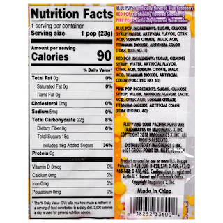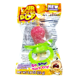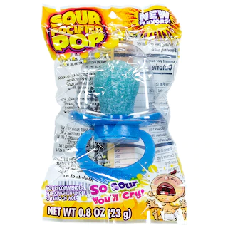 Enjoy these individually wrapped sour pacifier pops! These fun treats are shaped to look like pacifiers and are covered with a sour canding coating. There’s no need for tantrums, you can enjoy these sour treats anytime! These novelty pops are especially great for baby showers. Kids and adults love these sour candies that come assorted in red and blue. These 0.8-oz. candies are great for holiday parties, stocking stuffers, baby-themed events, and more. Not recommended for children under 3 years of age.