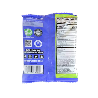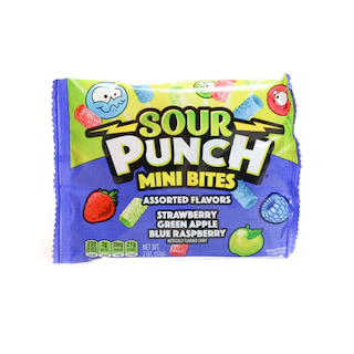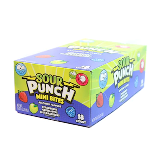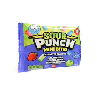 Craving something chewy and sour? Grab a bag of Sour Punch® Mini Bites! Each 2-oz. bag contains an assortment of artificially flavored chewy candy: strawberry, green apple, and blue raspberry. Great for on-the-go candy cravings or for resale in vending machines and convenience stores!