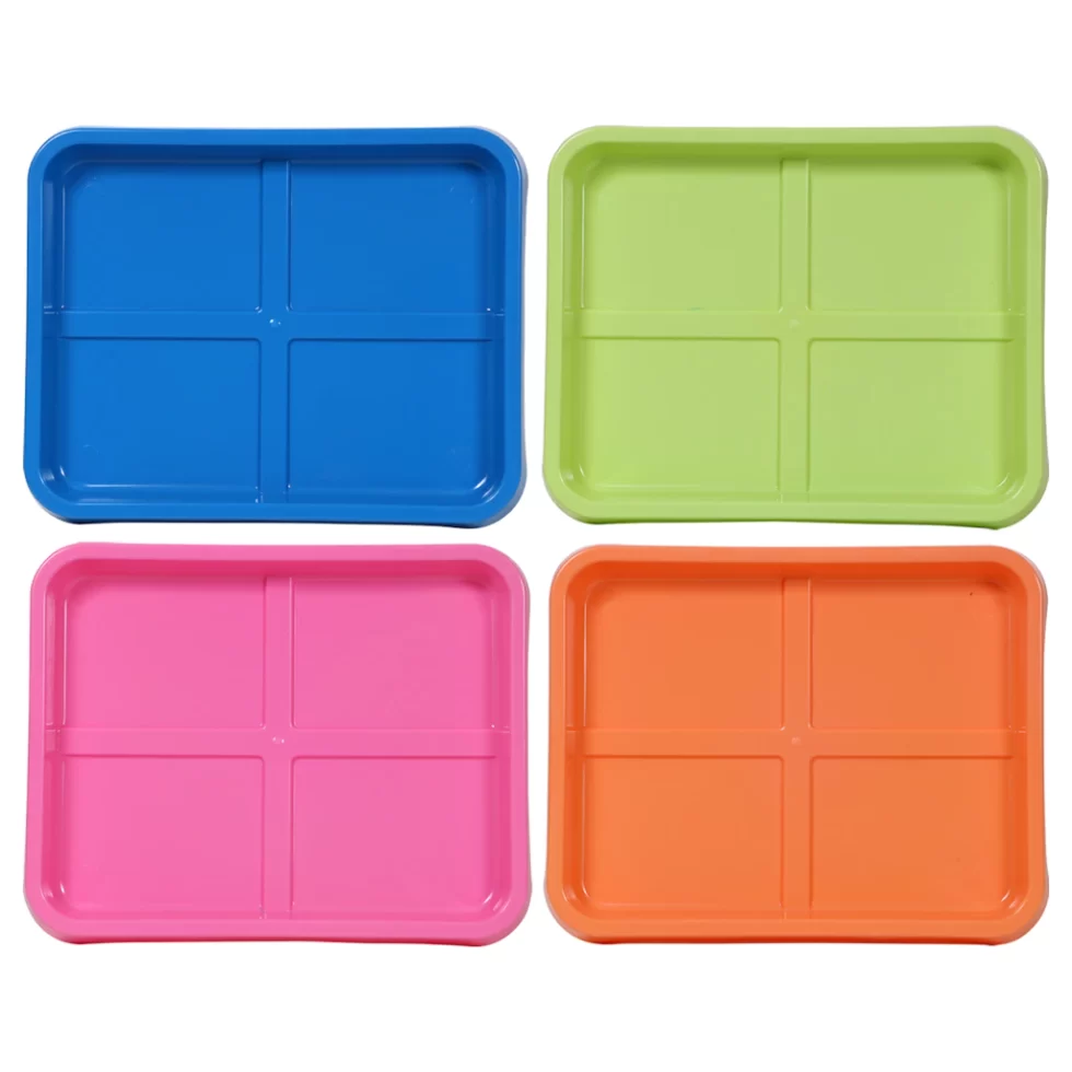 These brightly colored trays are perfect for keeping workspaces tidy! Each 10×8-in. tray is 1-in. deep and divided into four sections ideal for sorting small pieces like building blocks or craft beads. Assorted among green, blue, pink, and orange, these Teaching Tree® Plastic Activity Trays are washable, stackable, and portable. Great for homeschooling, Sunday school, art classes, crafting at home, and more!