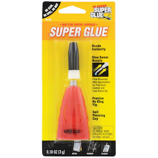 Stick to what works! The Original Super Glue® is packaged in a flow control dispenser and each 0.1-oz. tube of glue bonds instantly to metal, rubber, and plastic. The glue saver nozzle has a precise, no-clog tip, and a self-piercing cap.