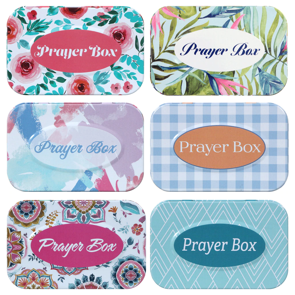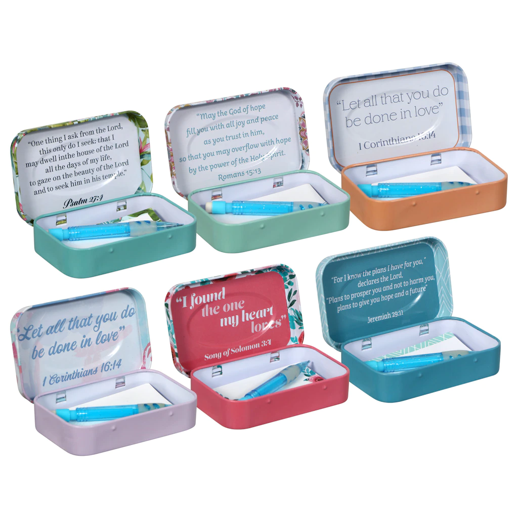 Assortment Details: 4×2.5-in. Tin Prayer Boxes with Notepads and Pencils assorted among the six styles shown. Assortment may vary.