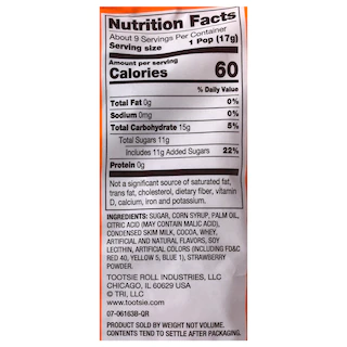 Everyone?s favorite candy-filled lollipop at a great value: 50% more to be exact! Tootsie Roll Pops have a chewy chocolaty candy center covered in a delicious hard candy coating and are individually wrapped for on-the-go snacking. With only 60 calories per fat-free pop this is the perfect guilt-free treat for home, work, and school.