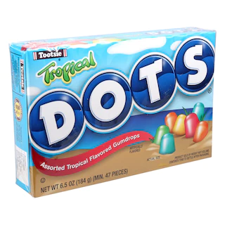 Tropical Dots Gumdrops are assorted among five exotic fruit flavors�?? Island Nectar, Wild Mango, Grapefruit Cooler, Carambola Melon, and Paradise Punch. These flavors satisfy the most discriminating sweet tooth cravings. Theater boxes make fun stocking stuffers, don’t forget these Tropical Dots Gumdrops.