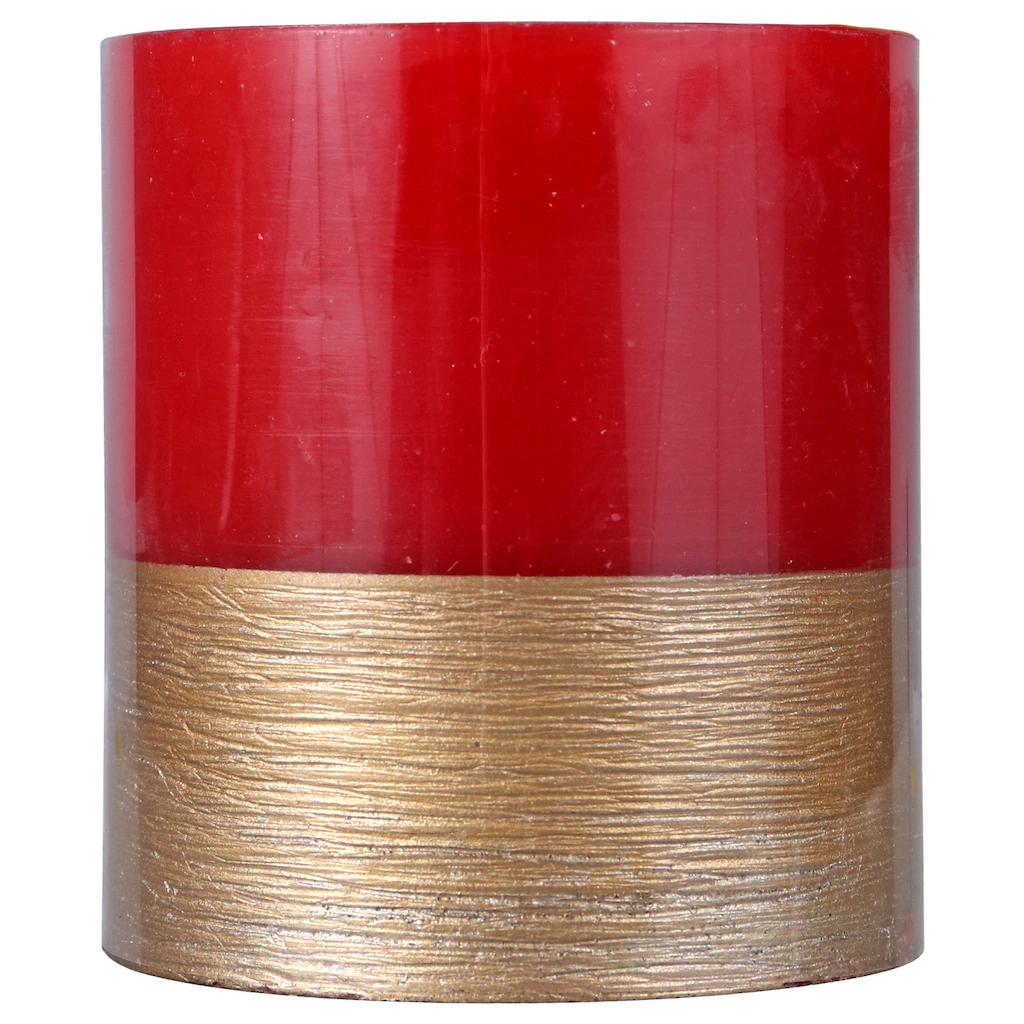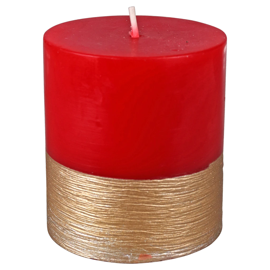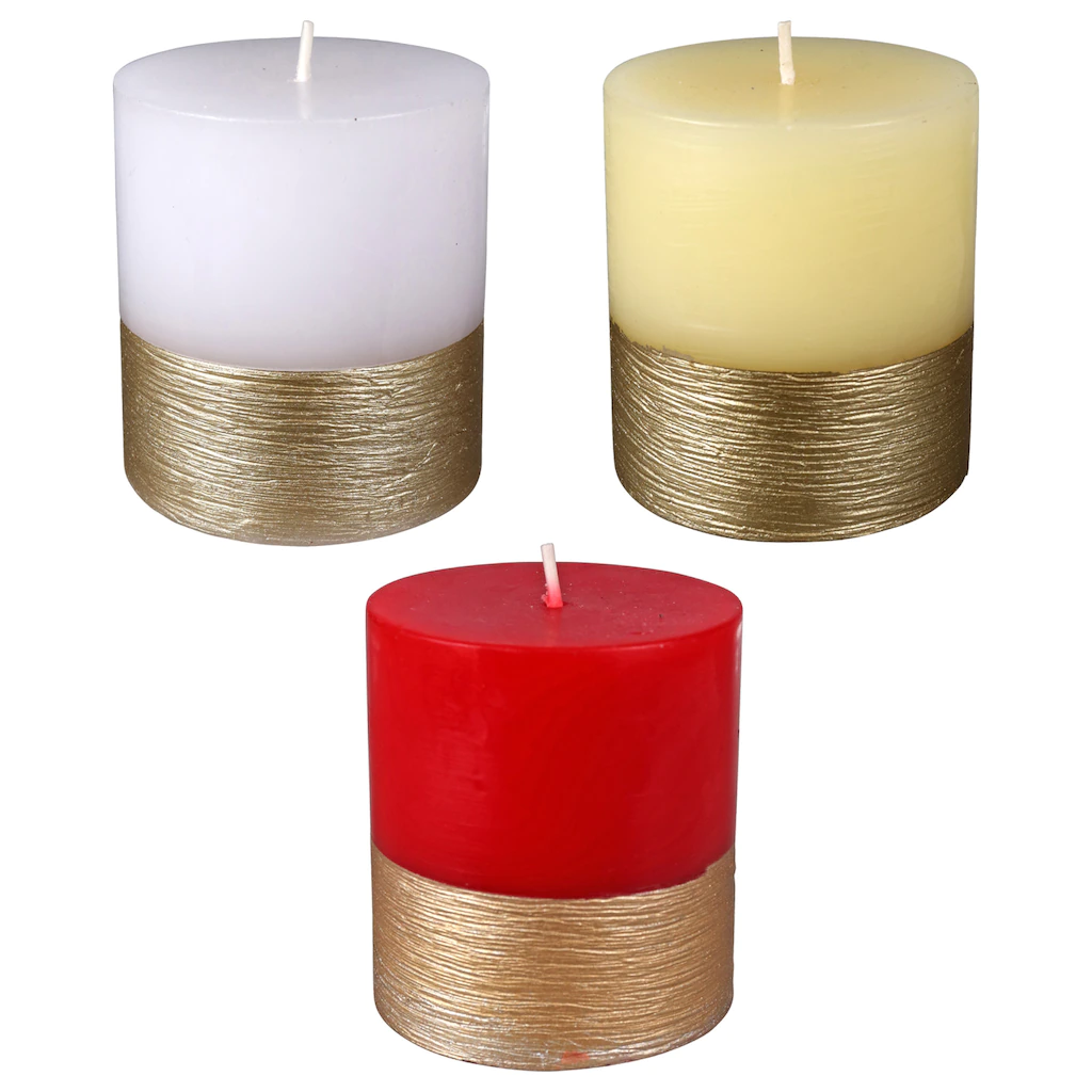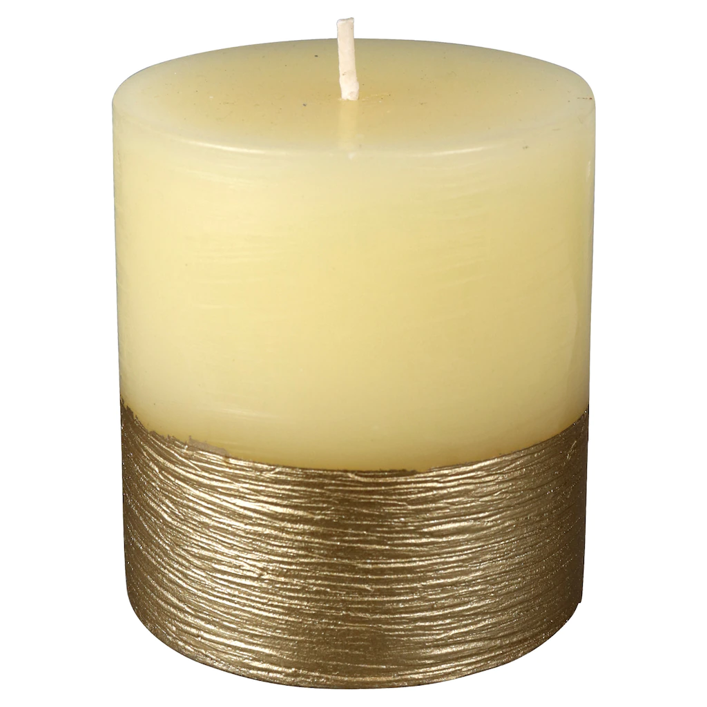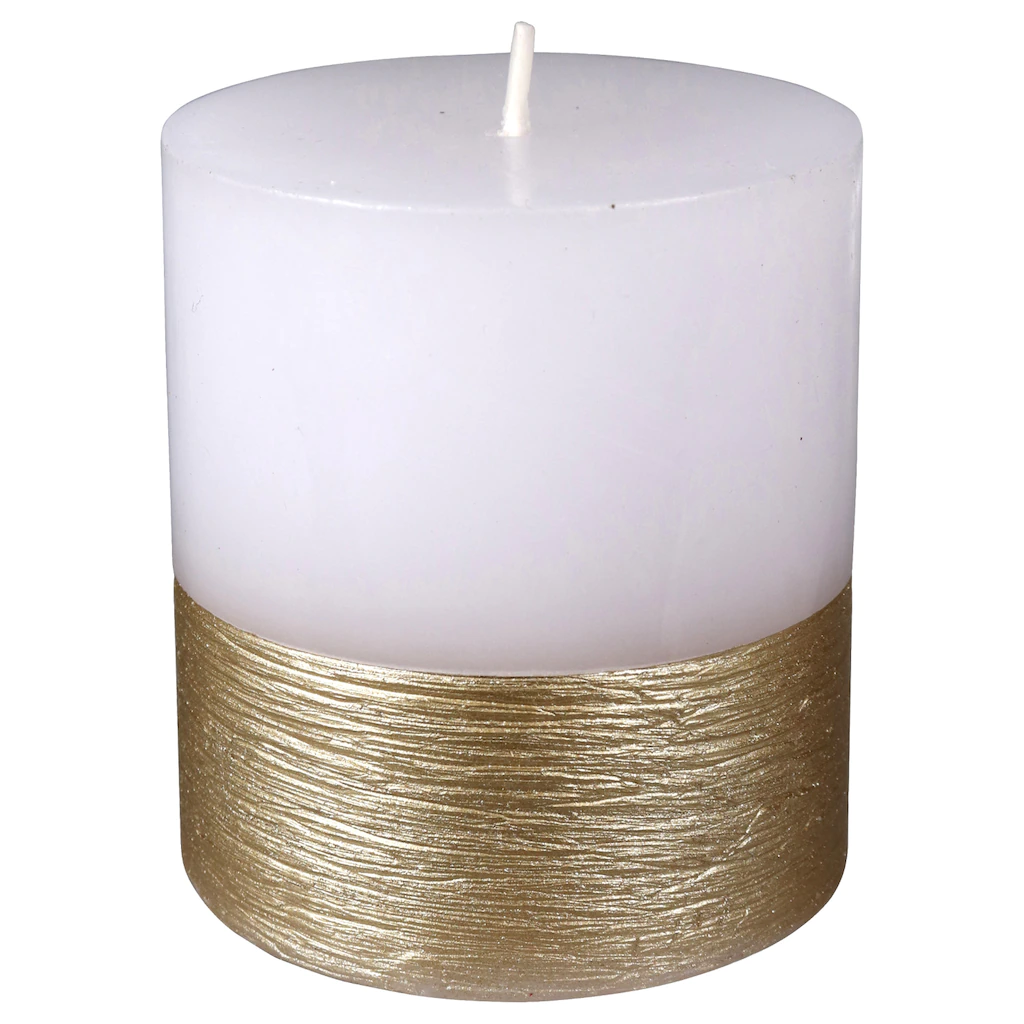 You’ll love our unscented pillars with the bottom one-third of the candle displaying a metallic gold color They are assorted among white, cream, and red. They are beautiful displayed by themselves and a real show stopper when displayed in groups. They’re also ideal when used in centerpieces, candleholders, mantel & shelf accents, and more.