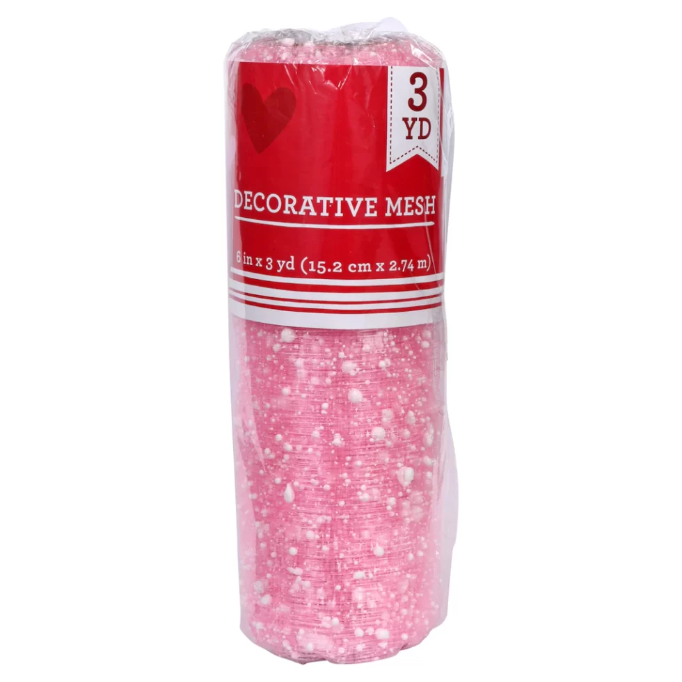 Assortment Details: 6-in.x3-yd. Valentine Glitter-Frosted Deco Mesh Ribbon assorted among pink, red, and dark pink.