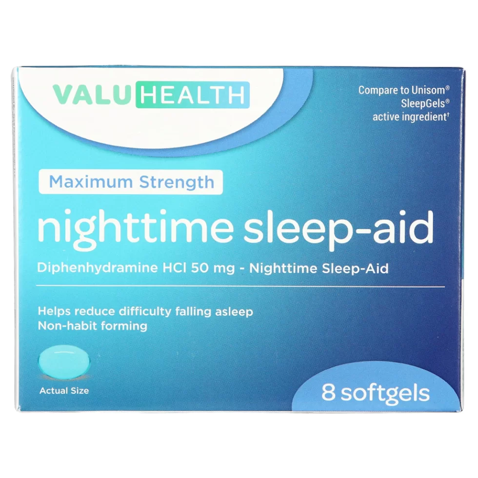 Assortment Details: 3.25×4.25-in. 8-ct. boxes of ValuHealth® Maximum Strength 50-mg. Diphenhydramine HCI Nighttime Sleep-Aid Softgels