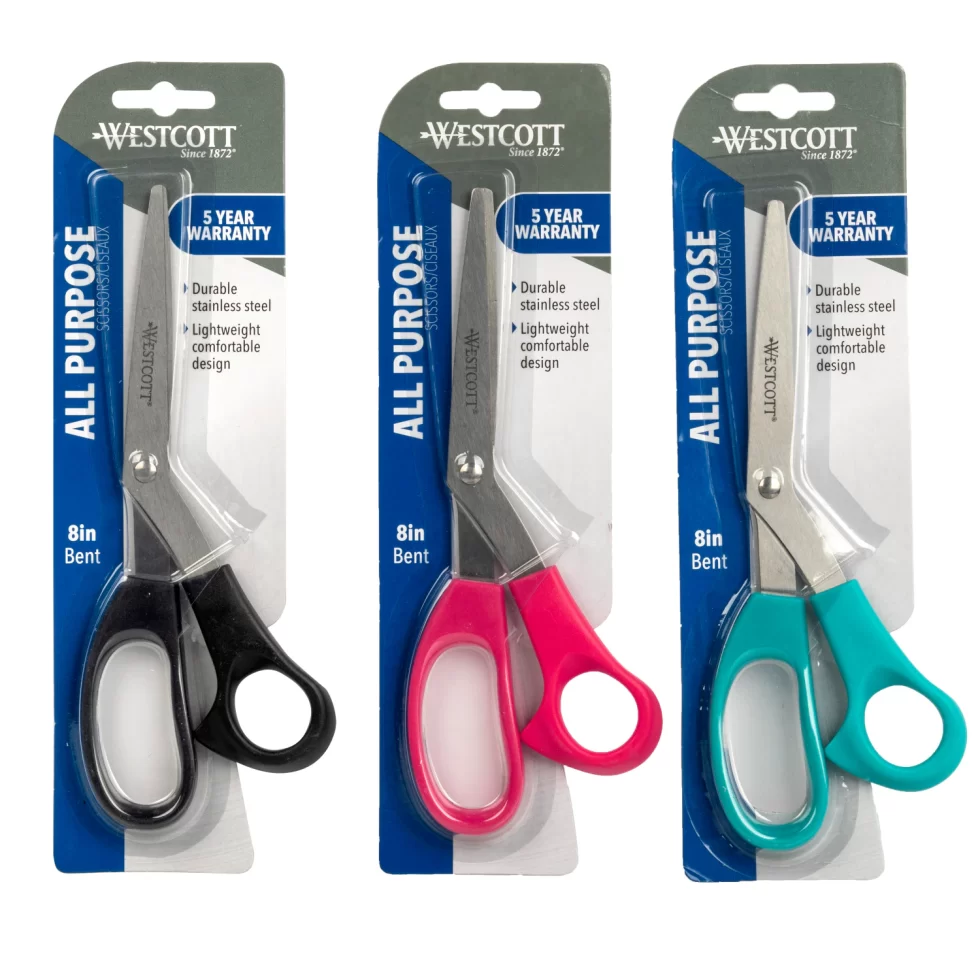Assortment Details: 8-in. Westcott™ All-Purpose Scissors assorted among blue, pink, and black.