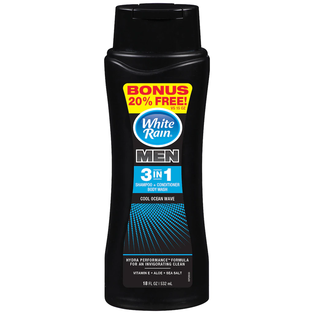 Assortment Details: 18-oz. Bottles of White Rain® For Men 3-in-1 Shampoo, Conditioner, and Body Wash