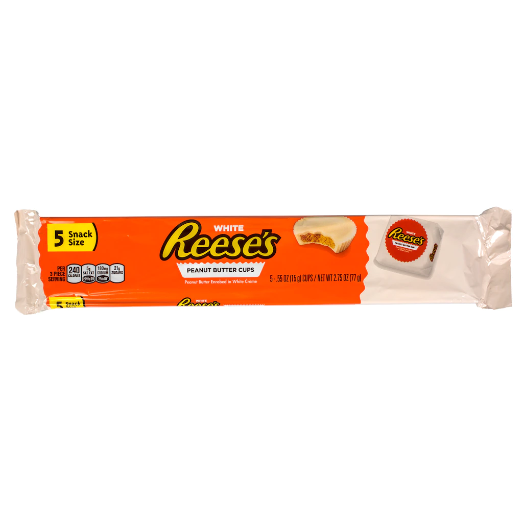 These decadent candies have peanut butter enrobed in white cr�me! Each 2.75-oz. pack of White Reese’s® Peanut Butter Cups includes five 0.55-oz. individually wrapped snack-size cups. Great for sharing with friends, including in care packages, and adding to candy bowls!