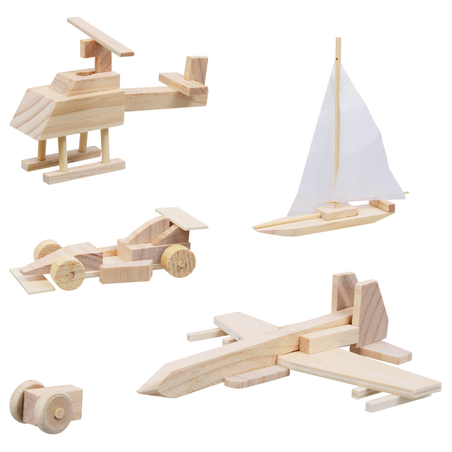 Kids of every age will have a great time putting together these wooden crafts. Each pack is easy to assemble and, when finished, displays 1 of of 4 fun designs: helicopters, fighter planes, sail boats, and race cars. Ideal for birthday party games, stocking stuffers, gift giving or event giveaways. Ideal for crafters and hobbyists. Ages 5+.