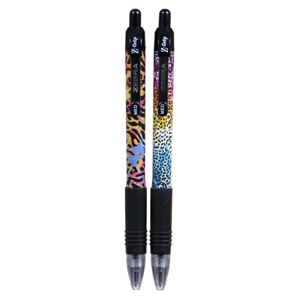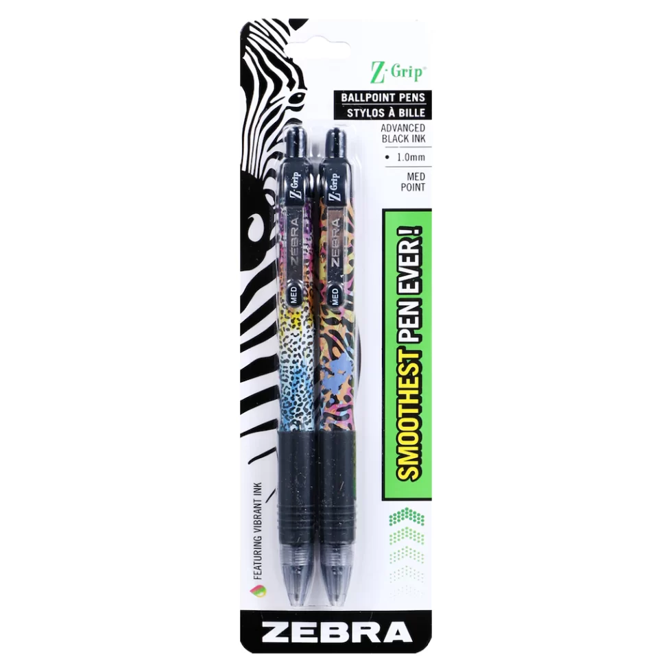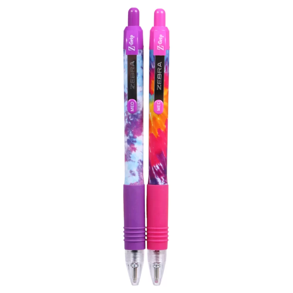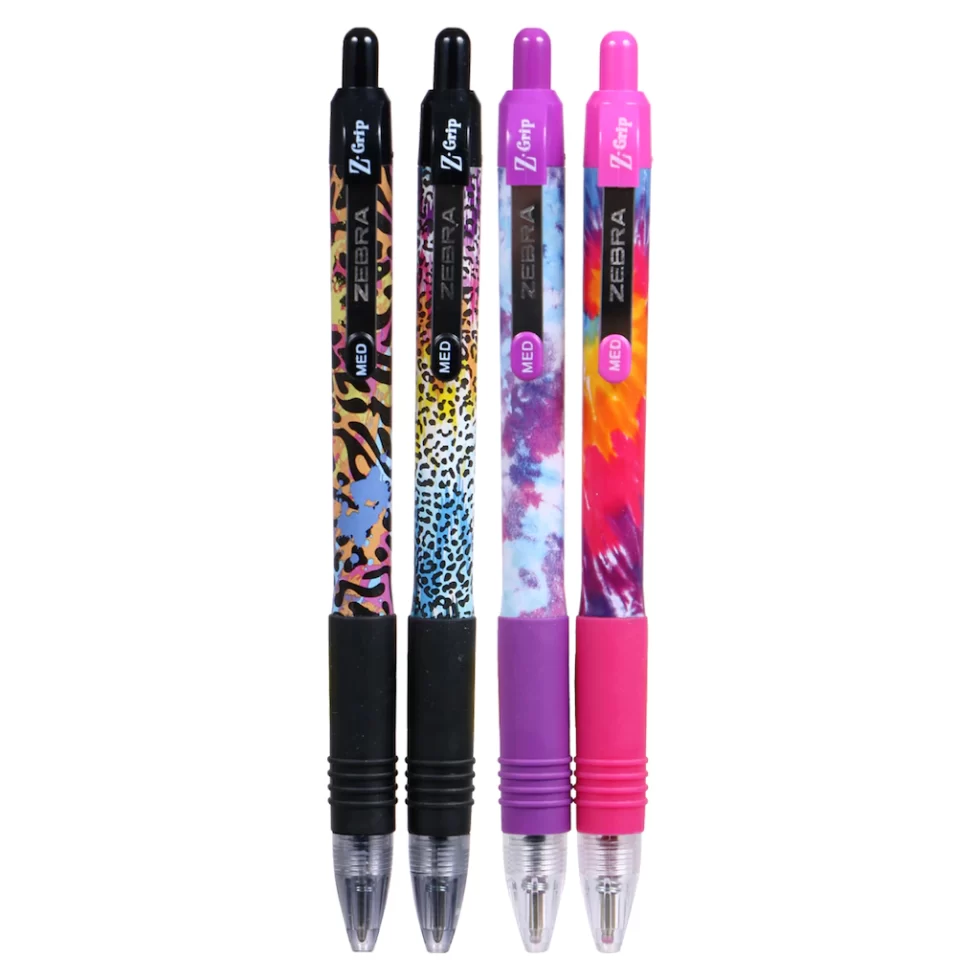 These Zebra Z-Grip® Fashion Ballpoint Pens are the smoothest pens ever! With 1.0-mm. medium point tips, these pens have advanced, vibrant ink for smooth, clear writing. Each pen has a comfort grip and a clip to secure them to folders, briefcases and backpacks, or your pocket. Assorted between 2-ct. packs with black accents and animal print designs or 2-ct. packs with pink and purple accents and tie dye designs, these ballpoint pens are ideal for back to school and use in the office!