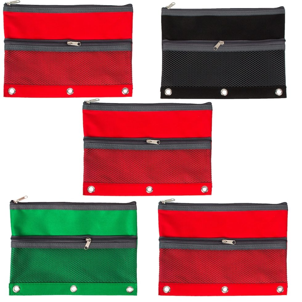 Assortment Details: 9.25×6.75-in. Zippered Binder Pouches with Mesh Pockets assorted among red, orange, black, green, and purple.